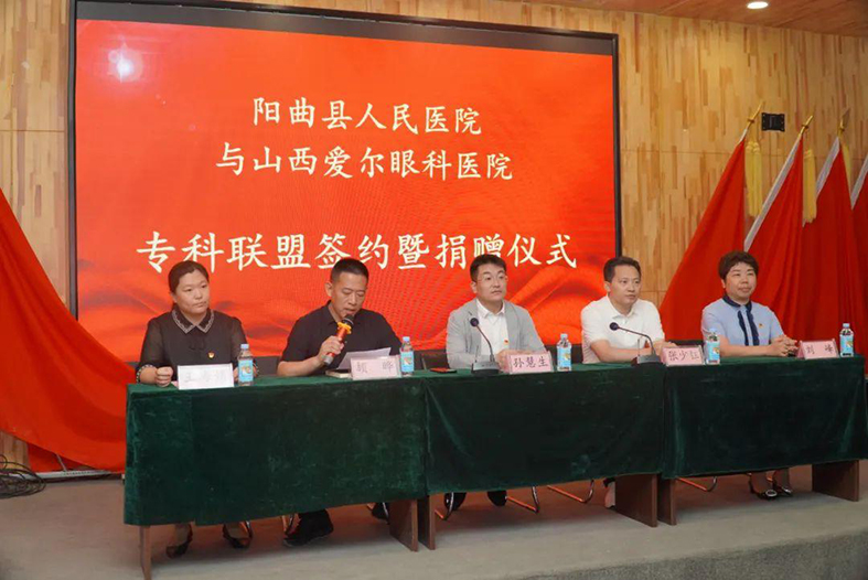 为推动阳曲县眼科医疗事业发展,充分发挥医疗资源效能,优化资源配置,满足县域人民群众的眼科诊疗需求,7月12日,山西省医院协会理事单位——阳曲县医疗集团人民医院与山西爱尔眼科医院在阳曲县爱国主义红色教育基地店子底村举行专科联盟签约暨捐赠仪式。阳曲县县委常委、副县长孙慧生,阳曲县卫健体局党委书记、局长颉晔,阳曲县人民医院党支部书记刘峰、副院长王海娟,爱尔眼科山西省区CEO张少钰等参会。