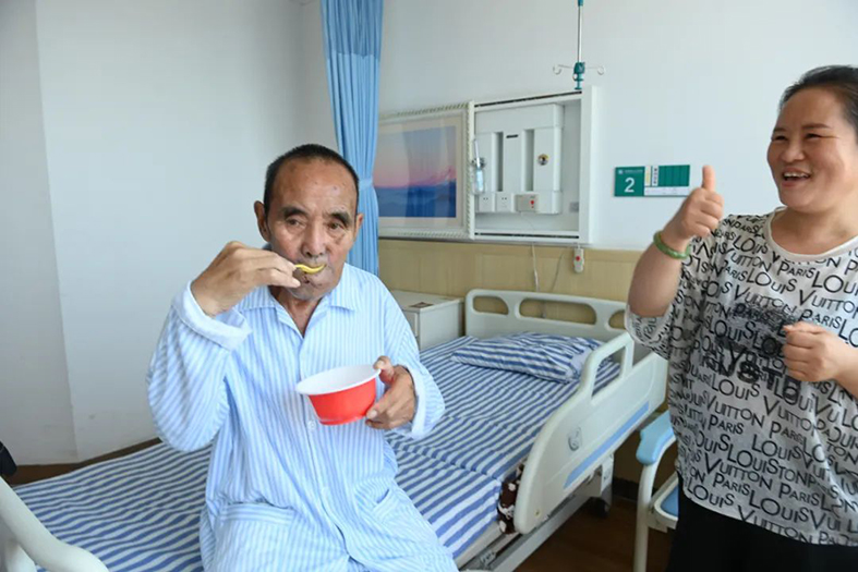 “慢慢张嘴,吞咽的时候小心。”7月7日上午,在山西省医院协会常务理事单位——晋中市第一人民医院(以下简称晋中一院)住院部口腔科颌面外科病区1302病房,当79岁的患者郎风成在医护人员的指导下顺利完成拔除胃管后的首次进食,陪伴在他身边的女儿郎爱珍不禁流下欣喜的热泪。