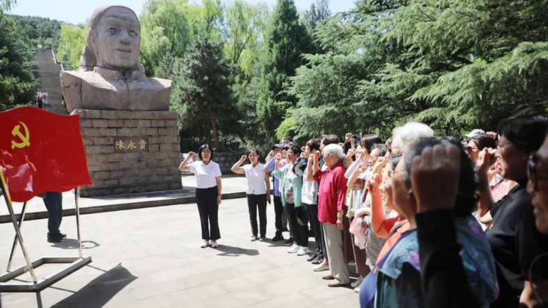 在大寨展览馆外,离退休干部党员面对党旗,高举右拳,庄严宣誓,重温入党誓词,用铮铮誓言彰显永恒初心。
