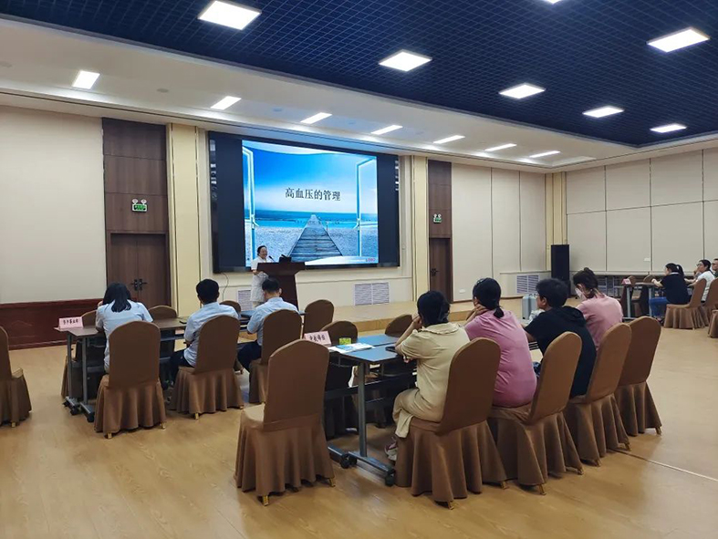 活动中,急诊科主任王绛博开展了“高血压管理知识”讲座,简单清晰地向大家讲解了什么是高血压、高血压的分类、诊断与治疗等内容,用工作中的实例介绍了高血压带来的危害,还针对职工平时的生活习惯提出一系列建议,如合理膳食、适量运动、戒烟限酒、控制体重等,并提醒大家注意定期进行身体健康检查。预防保健科主任姚锐为工会职工进行义诊、测量血压并解答问题。