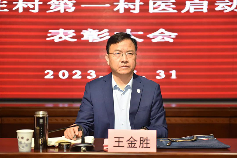 王金胜在讲话中指出,值此学习贯彻习近平新时代中国特色社会主义思想主题教育在全党深入开展之际,我们召开此次会议具有特殊而重要的意义,是新时期践行“学思想、强党性、重实践、建新功”总要求吹响的又一个集结号和冲锋号。我们派出的第一村医无怨无悔,甘于奉献,高质量完成了各项工作任务,折射出“护佑生命、大爱无疆,救死扶伤、甘于奉献”的新时期卫生职业精神,蕴含着为农助农乐农富农淳朴无私的民生情怀,为全校广大师生员工树立了楷模和榜样。第一村医工作要取得更大的成就,同样需要我们接续用力,久久为功,需要我们开动脑筋、创新思路,优化机制、协同用力,真正地把农民群众期待的心情转化为推动工作的动力,解民忧、排民难、暖民心,心无旁鹜地把好事办实办细办到农民朋友的心坎上,要踔厉奋发、戮力同心,让实干肯干能干成为引领全校干事创业的主旋律、主基调。