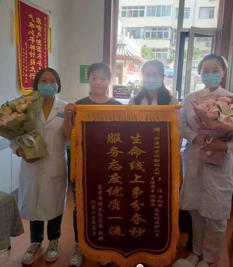 此例患者从入院到开始溶栓治疗,仅用33分钟。溶栓20分钟后,安阿姨言语謇涩及患肢不遂情况得到明显改善,患肢已经能自主抬举。溶栓的神奇效果,让安阿姨及其家属惊叹不已,送来锦旗和鲜花表示感谢。