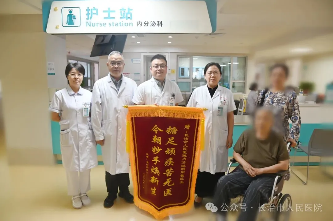 8月26日,76岁的李大妈(化名)在家人陪伴下,专程来到山西省医院协会副会长单位——长治市人民医院内分泌科,将一面写有“糖足顽疾苦无医 今朝妙手焕新生”的锦旗送到周敏医师手中,表达全家深深的感激之情。