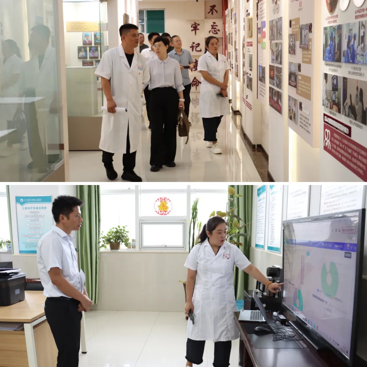 会后,夏县人民医院一行在连晓彬的陪同下参观了院史馆,详细了解乡宁县人民医院的发展历程、文化建设情况。随后,一行人前往慢病管理中心,察看信息化管理系统、诊疗流程规范及患者健康宣教等工作开展情况,双方就慢病管理中的细节问题进行了交流。