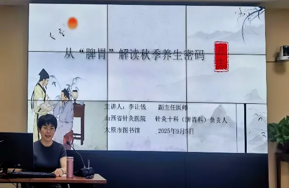 2025年9月6日,山西省医院协会副会长单位——山西省针灸医院针灸十(脾胃病)科走进太原市图书馆“市民课堂”,开展了“从‘脾胃’解读秋季养生密码”公益讲座。针灸十(脾胃病)科负责人李让钱副主任医师担任主讲,与听众一起探讨中医的奥秘,现场气氛高涨。