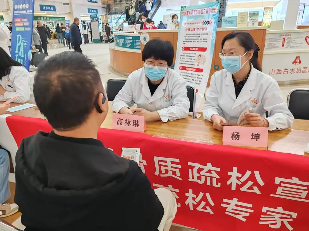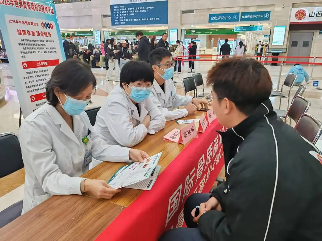 每年的10月20日是世界骨质疏松日。2025年的中国主题为“健康体重,强骨健身”,体现了当前骨质疏松防治以预防为主、关口前移的策略,倡议社会各界保持骨骼健康、促进全身健康的理念。为积极响应号召,提高公众对骨质疏松的认识和预防意识,10月20日上午,山西省医院协会副会长单位——山西白求恩医院 同济山西医院在门诊一楼大厅成功举办了大型义诊活动。
