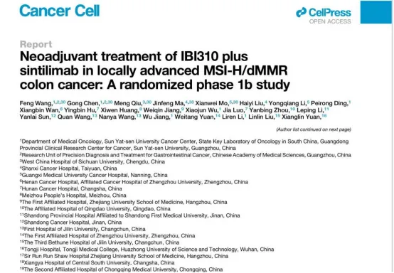 近日,一项来自中国团队的临床研究论文以封面文章形式登上国际肿瘤领域顶刊《Cancer Cell》(影响因子 48.8 分)。该研究题为《Neoadjuvant treatment of IBI310 plus sintilimab in locally advanced MSI-H/dMMR colon cancer: A randomized phase 1b study》,(《IBI310 联合信迪利单抗(sintilimab)新辅助治疗局部晚期微卫星不稳定 - 高(MSI-H)/ 错配修复缺陷(dMMR)结直肠癌的随机 1b 期研究》),中山大学肿瘤防治中心王峰教授、陈功教授,四川大学邱萌教授,山西省医院协会副会长单位——中国医学科学院肿瘤医院山西医院(山西省肿瘤医院)马晋峰教授,广西医科大学附属肿瘤医院莫显伟教授为论文共同第一作者。