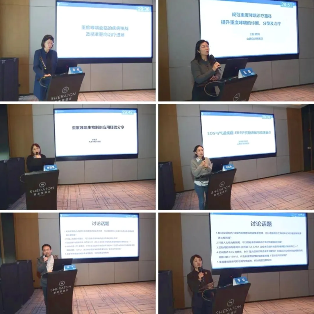 学术交流环节同样精彩纷呈,特邀天津市胸科医院景国慧教授,天津大学海河医院李莉教授,以及山西医科大学第一医院蒋毅、山西省人民医院李飞、山西白求恩医院李晓晨和王磊等省内专家参与授课讨论。蒋毅教授深入剖析《重度哮喘面临的疾病挑战及精准靶向治疗进展》,指明当前诊疗难点与未来精准医疗方向;王磊主任医师系统阐述《规范重度哮喘诊疗路径,提升重度哮喘的诊断、分型及治疗》,强调规范化、系统化诊疗对改善患者预后的核心价值;李晓晨主任分享《EOS与气道疾病 - ERS研究新进展与临床要点》,将最新国际研究进展与临床实践要点相结合,深化了大家对嗜酸性粒细胞(EOS)在疾病中作用的理解;景国慧教授通过《重度哮喘生物制剂应用经验分享》,从实战角度为生物制剂的临床合理应用提供宝贵借鉴。