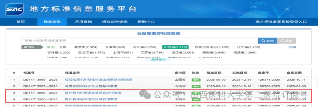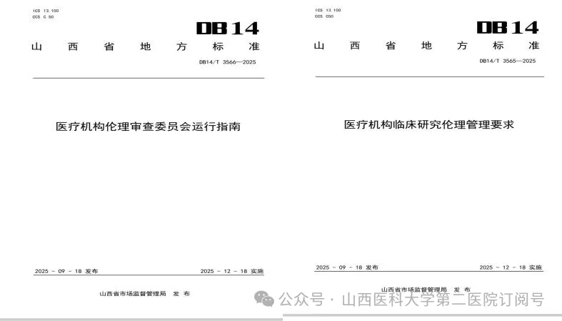 目前,山西省市场监督管理局已通过2025年山西新备案地方标准公告(图一)对两项标准予以公布,标准文本(图二)也已正式对外发布,将逐步在全省医疗机构中推广实施。业内人士表示,两项标准的落地,将为山西省临床研究的健康发展注入“伦理动力”,助力省内医疗行业在规范中创新,在创新中保障民生福祉。(任方刚 高志国 王红 吴梦越)
