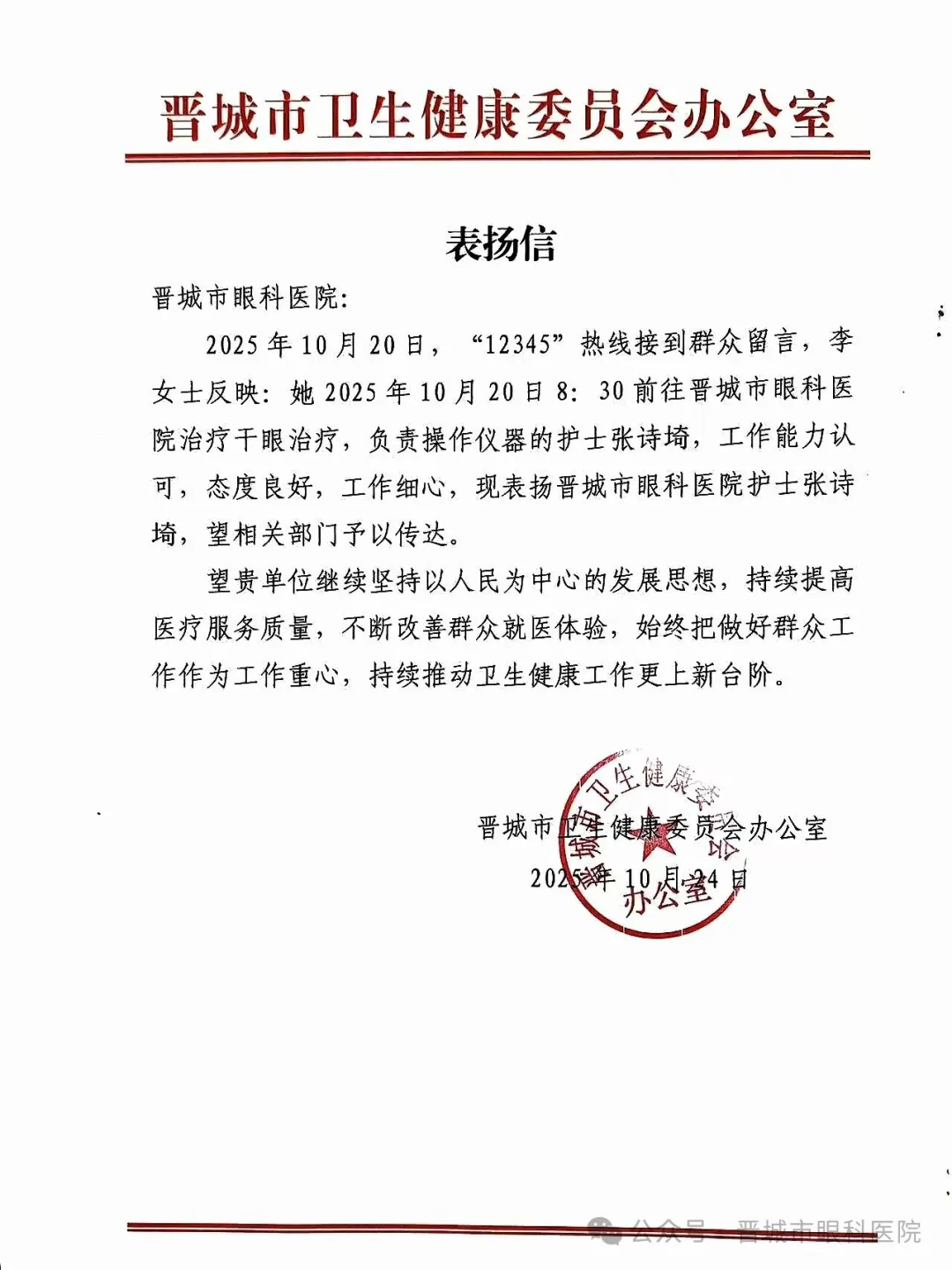 这份来自群众的认可,也得到了市卫生健康主管部门的重视。晋城市卫生健康委员会办公室在表扬信中提出,张诗埼的表现是医疗工作者践行“以人民为中心”服务理念的具体化体现,医院要持续提升医疗服务质量,增进群众就医获得感。