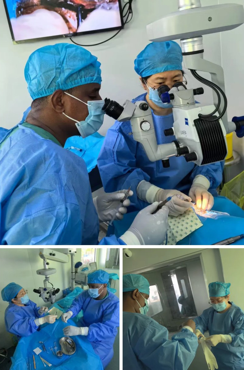 柴飞燕则守候在手术台旁,时刻关注着Ibrahim的无菌操作,从戴手套、铺单、递器械、点水开始一点一点的强调无菌意识,慢慢地教会他如何装置人工晶状体,每一步操作都用心去交流,用行动去教诲,时刻关注着无菌观念和操作方式,一旦发现违规立即指出加以强调并且改正。
