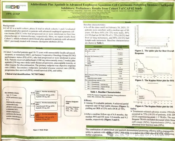 大会期间,赵军教授作为课题研究的第一作者,代表团队向全球同行展示了项目探索成果。该研究聚焦我国高发疾病食管鳞癌的临床难点,针对一线免疫治疗进展后的二线治疗方案进行积极探索,结果显示其具备良好的疗效潜力和可控的安全性,为临床实践提供了新的思路。