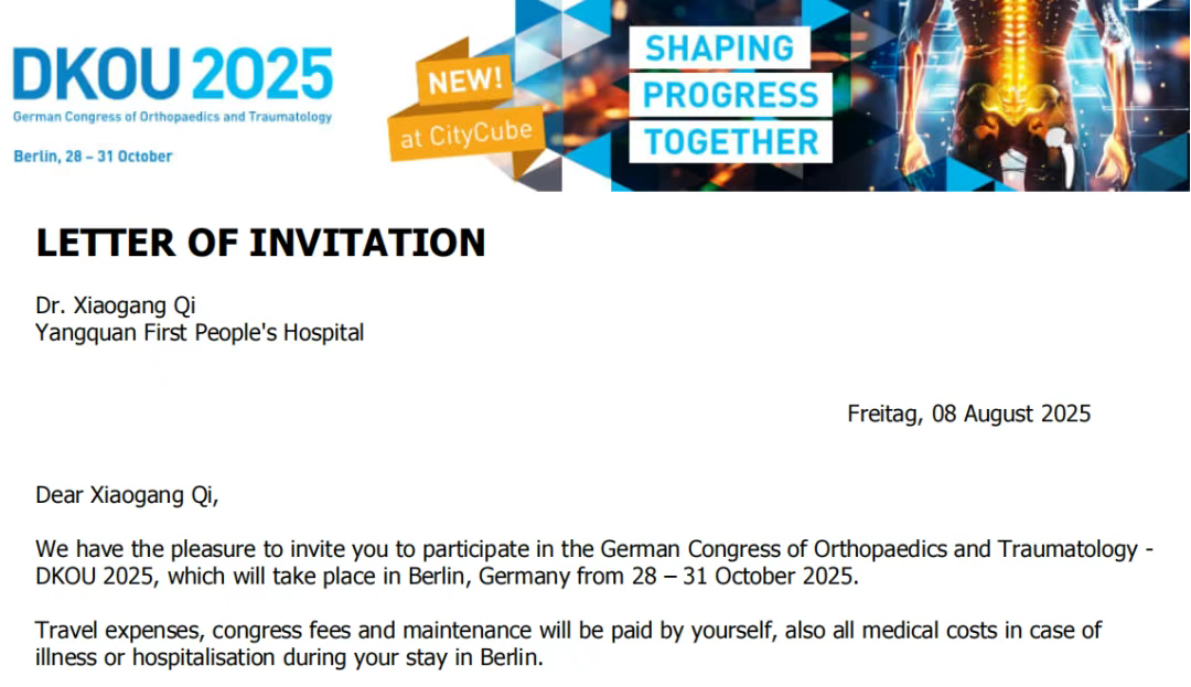 近日,山西省医院协会常务理事单位——阳泉市第一人民医院骨科在读博士、骨科副主任兼技术主任祁晓刚获官方邀请,不远万里前往德国柏林,参加了享誉全球的德国骨科与创伤学术年会。作为骨科领域的顶级学术盛会,此次参会不仅是一次深入汲取前沿学术知识的难得机会,更是医院青年医师在国际舞台上展现风采的重要契机。