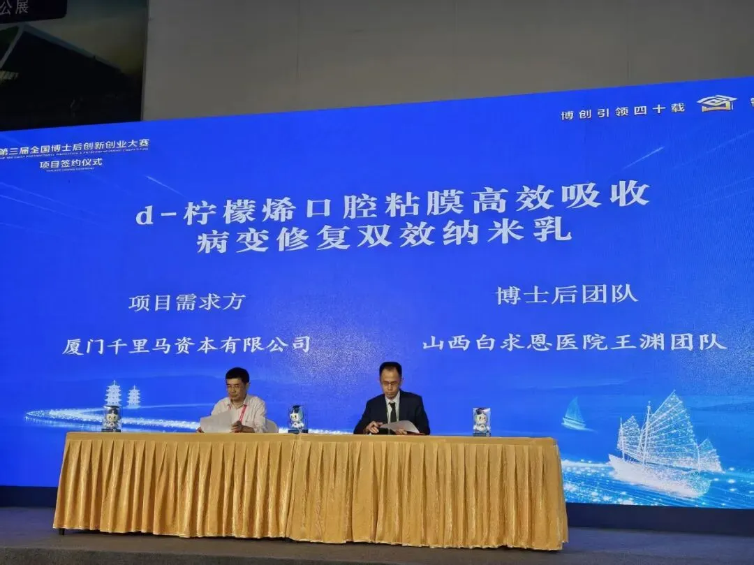 日前,由人力资源社会保障部、福建省人民政府共同主办的第三届全国博士后创新创业大赛总决赛在福建泉州举行,山西省医院协会副会长单位——山西白求恩医院 同济山西医院王渊博士后团队,凭借“柠檬烯口腔黏膜高效吸收/修复双效乳剂”项目与厦门千里马资本有限公司签署意向协议,实现该院博士后在国赛舞台上科技成果转化零的突破!