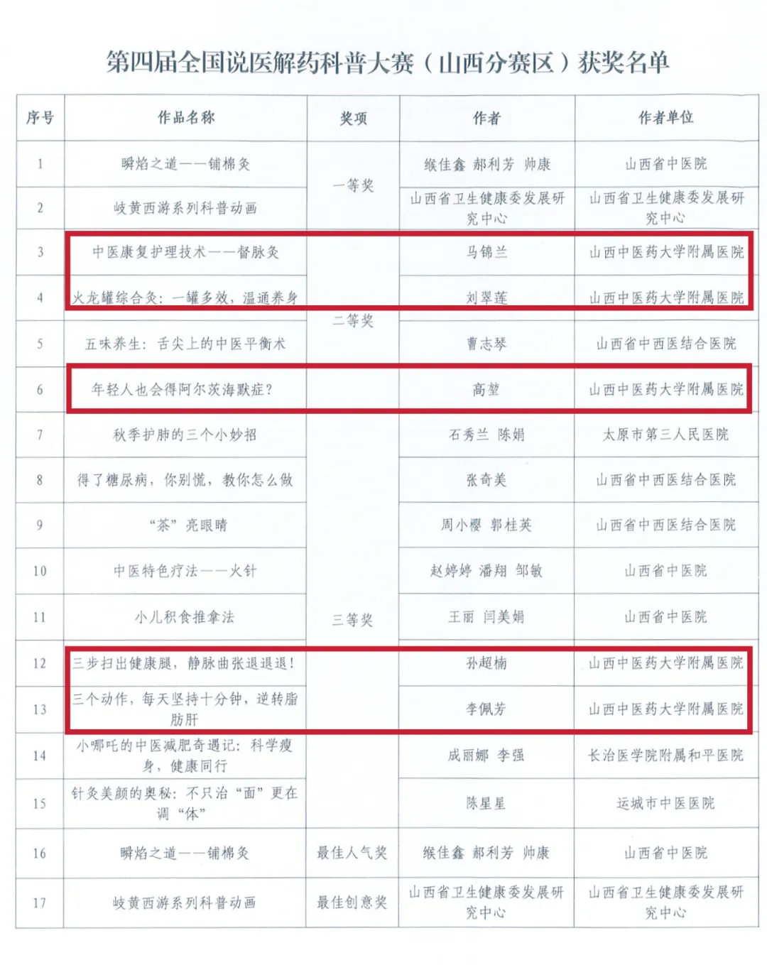 本届大赛山西赛区活动收到大量投稿作品。通过专家评审、线上投票等环节,共评选出一等奖2个、二等奖4个、三等奖9个,以及山西分赛区最佳人气奖和最佳创意奖各1个。山西中医药大学附属医院选送的作品凭借严谨的学术内涵、通俗的表达方式、生动的传播形式脱颖而出。