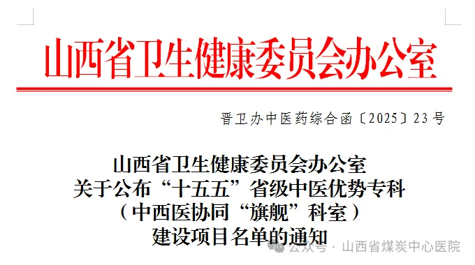 近日,山西省卫生健康委员会办公室公布“十五五”省级中医优势专科(中西医协同“旗舰”科室)建设项目名单,山西省医院协会副会长单位——山西省老年医院(山西省煤炭中心医院)中医科凭借雄厚的综合实力与鲜明的诊疗特色,通过答辩与评审,跻身其中,实现了该院在省级重点专科领域零的突破。