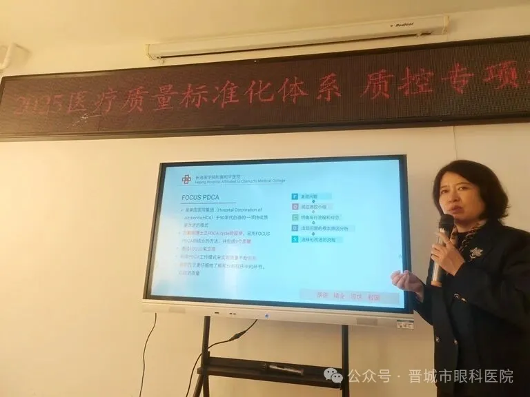 为进一步强化医疗质量管理,夯实医疗核心制度执行效果,全面提升医院整体服务水平,11月15日,山西省医院协会理事单位——晋城市眼科医院邀请长治医学院附属和平医院质控办主任、医疗质量管理师尚俊芳,开展2025医疗质量标准化体系质控专项培训会。医院副院长(主持工作)薛琴芹、副院长常茹雷、工会主席郭晋霞出席会议。科主任、质控员及临床医生共50多人参加培训。