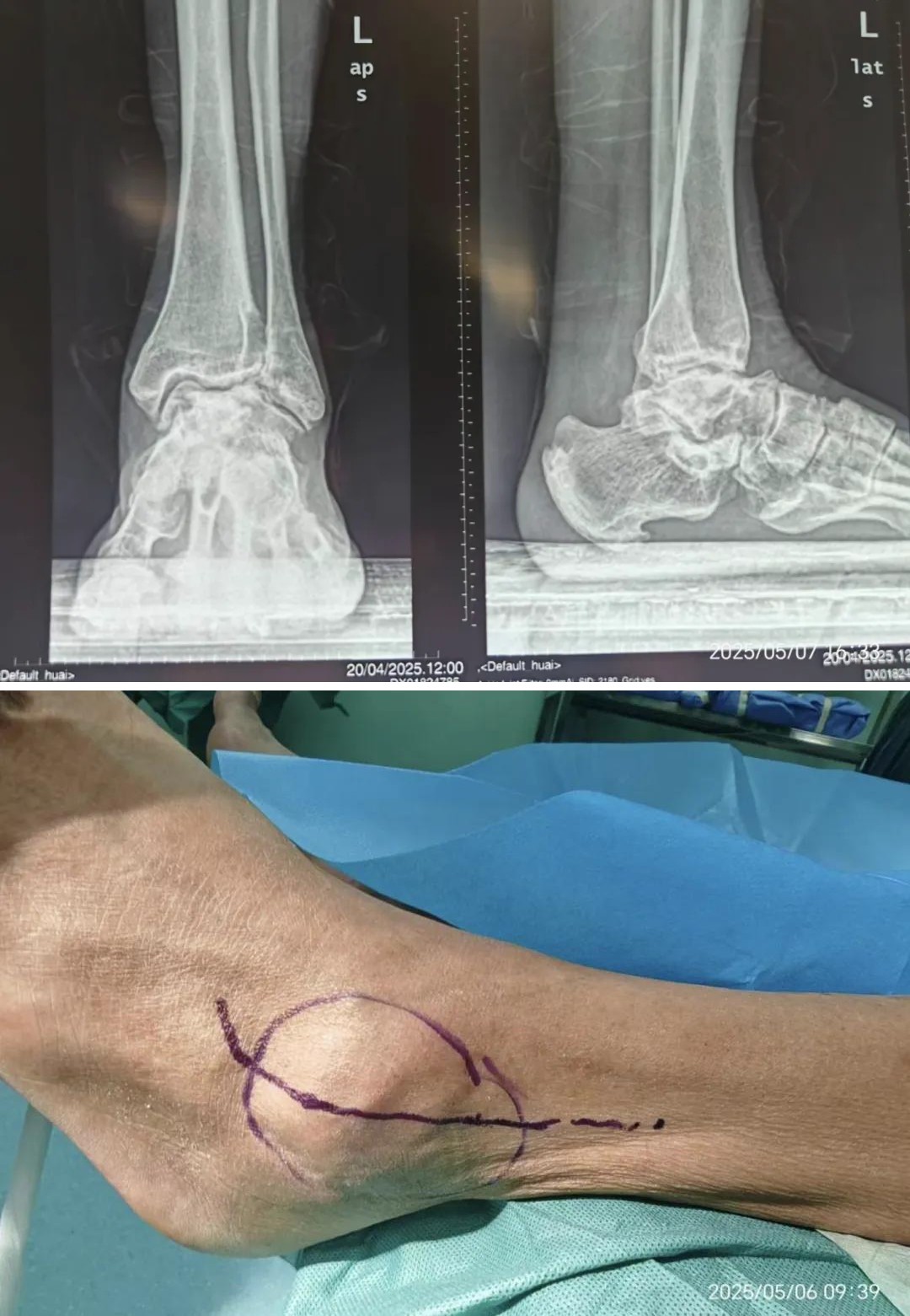 ▲术前,踝关节外观显示关节变形、肿大,走路时局部疼痛明显