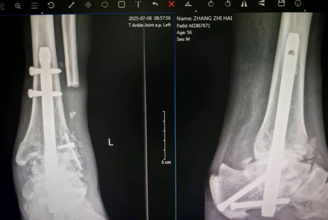 骨科足踝专业小组张彬、张志伟两位主治医师经过共同研讨,决定采用先进的逆行髓内钉技术进行胫骨与跟关节融合手术,并成功实施。术后5个月回访,患者表示,走路再无疼痛感,已能够完全脱拐行走,正常参与社交活动和日常出行,生活质量得到显著提升。