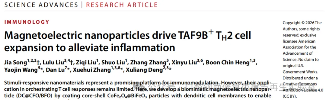 日前,山西省医院协会常务理事单位——晋中市第一人民医院发布消息,该院张学慧科研团队在Science Advances发表题为“Magnetoelectric nanoparticles drive TAF9B+ TH2 cell expansion to alleviate inflammation”的研究(IF:12.5),研发出树突状细胞膜包被的仿生磁电纳米颗粒DC@CFO/BFO,为自身免疫性炎症治疗开辟新路径。