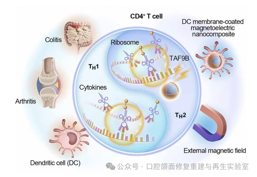 该纳米颗粒以CFO/BFO为磁电核心,可特异性靶向CD4+T细胞,在磁场刺激下定位于核糖体,通过调控静电相互作用增强蛋白合成,诱导IL-4产生并激活转录因子TAF9B,驱动TH2细胞极化增殖,抑制促炎的TH1、TH17细胞,重建TH1/TH2免疫平衡,且TAF9B是该调控过程的关键分子。