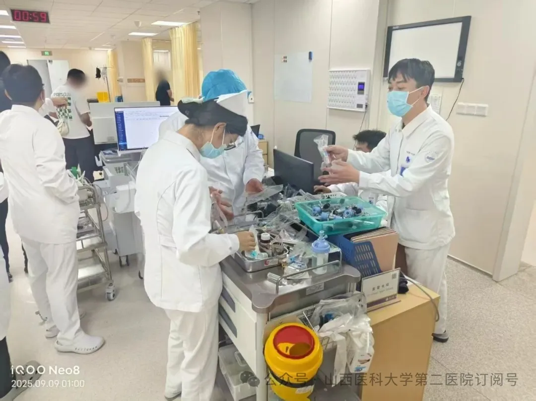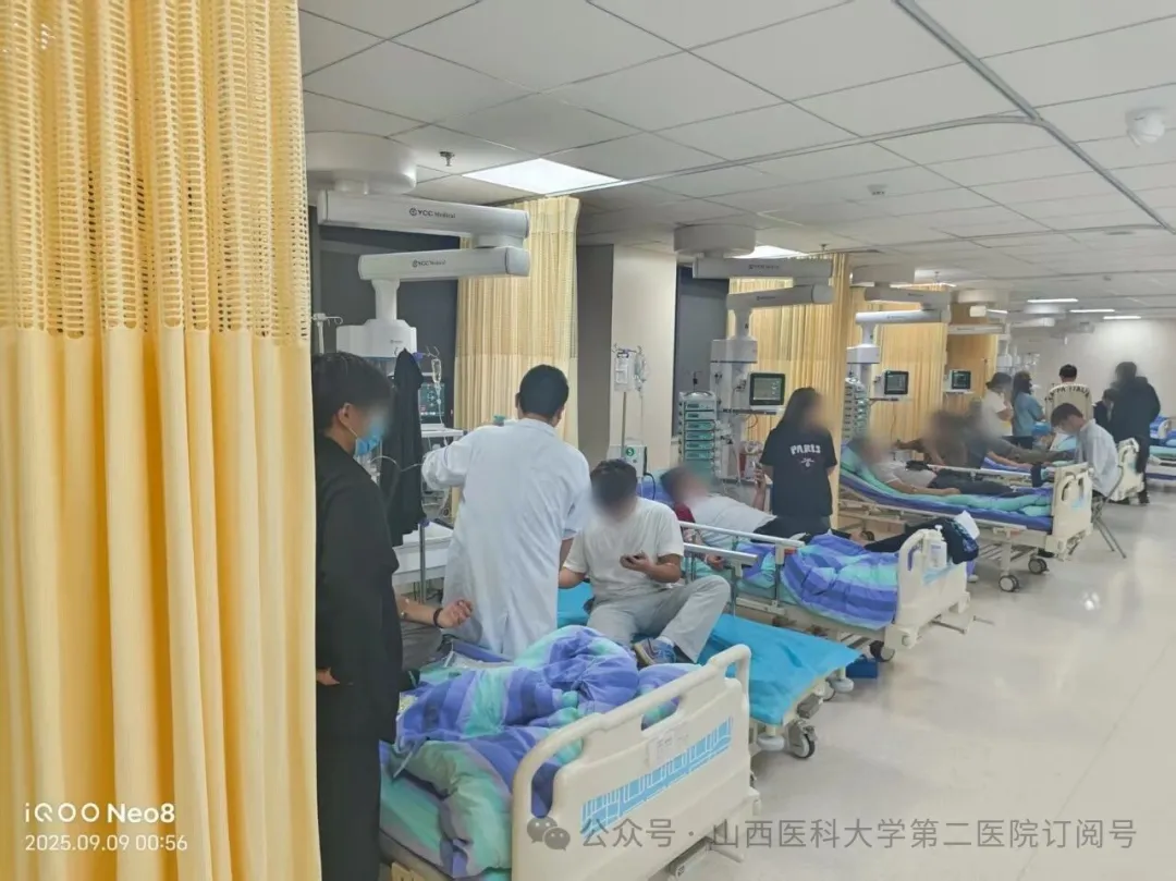 山西医科大学第二医院南院区急诊科设有急诊内科、急诊外科、五官科、神经内科、隔离诊室、骨科家庭病房诊室等诊室,配备有创呼吸机、无创呼吸机、高流量氧疗机、心肺复苏仪、多功能监护仪、微量泵、床旁血液净化机、床旁超声仪、快速血气分析仪、心梗标志物检测仪、血液灌流机、冰毯-冰帽机以及IBP+PICCO+呼末二氧化碳多模块监测等多种先进设备。