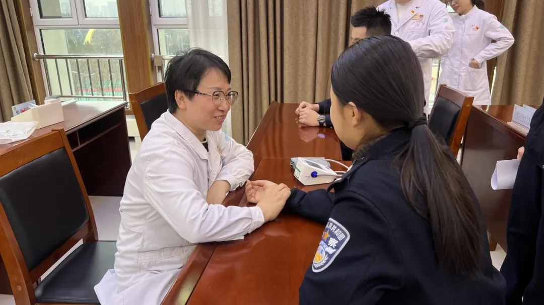 义诊环节,支部医护团队为公安干警们提供一对一健康咨询、答疑解惑服务,开展血压测量、中医把脉、看诊、针刺、耳穴压豆等特色诊疗项目,详细了解干警的身体状况,针对性给出中医调理建议和健康指导。