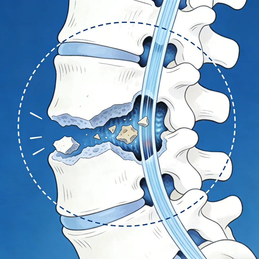 王先生在骑行中发生严重碰撞,导致腰椎爆裂性骨折。碎裂的骨块压迫脊椎神经,让他的右腿瞬间失去知觉。其被送到中化二建集团医院急诊科时,右腿已经不听使唤。影像结果让骨科李睿明主任团队心中一紧:这是典型的腰椎爆裂性骨折伴椎管狭窄,可能导致神经功能的永久损伤。