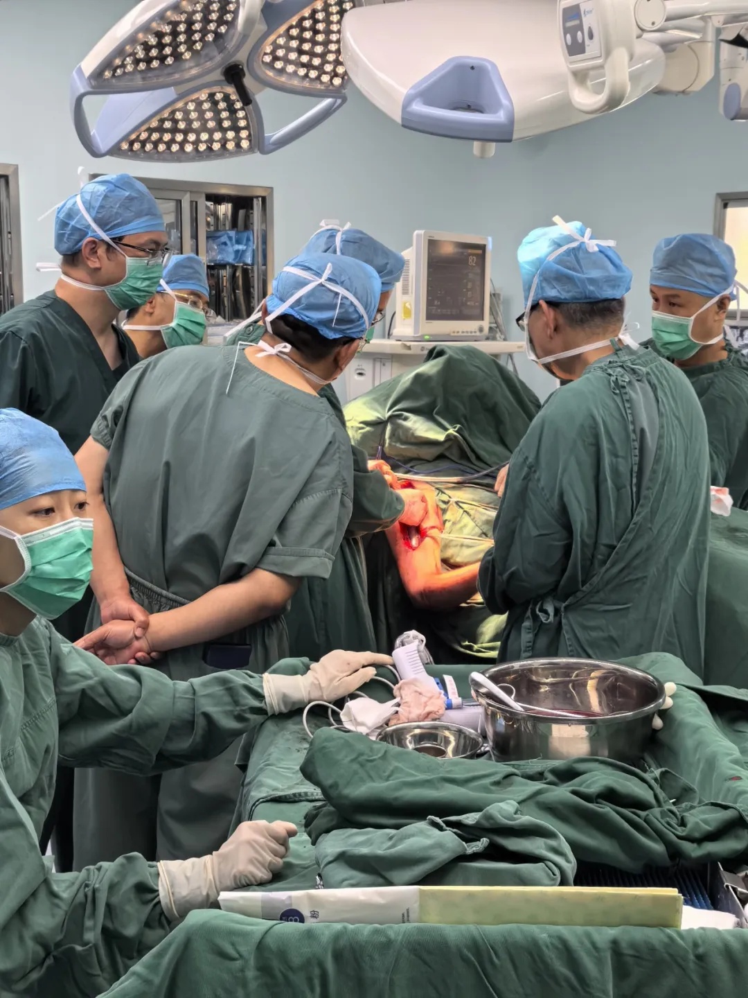 患者入院时右肩部疼痛、肿胀、活动受限,经详细检查后诊断为“右肱骨近端病理性骨折伴肩关节脱位;多发性骨髓瘤”。为满足患者和家属迫切手术的需求,骨科主任安鹏带领科室医疗团队认真讨论病情,并进行多学科会诊,为患者精准个体化治疗。2024年7月6日,安鹏团队在山西医科大学第二医院骨科骨肿瘤专业专家李立志指导下成功为患者进行了手术。目前,患者状况良好,达到预期治疗效果,将逐步开展康复锻炼。