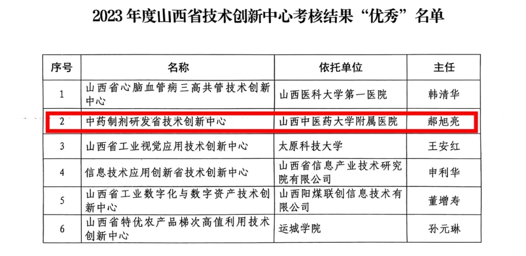 近日,山西省科学技术厅公布2023年省重点实验室和省技术创新中心考核评价结果,依托山西省医院协会副会长单位——山西中医药大学附属医院建设的山西省中药制剂研发技术创新中心在考核中获得“优秀”等次,并将获得50万元经费支持。这是该中心连续两年取得年度考核优秀。