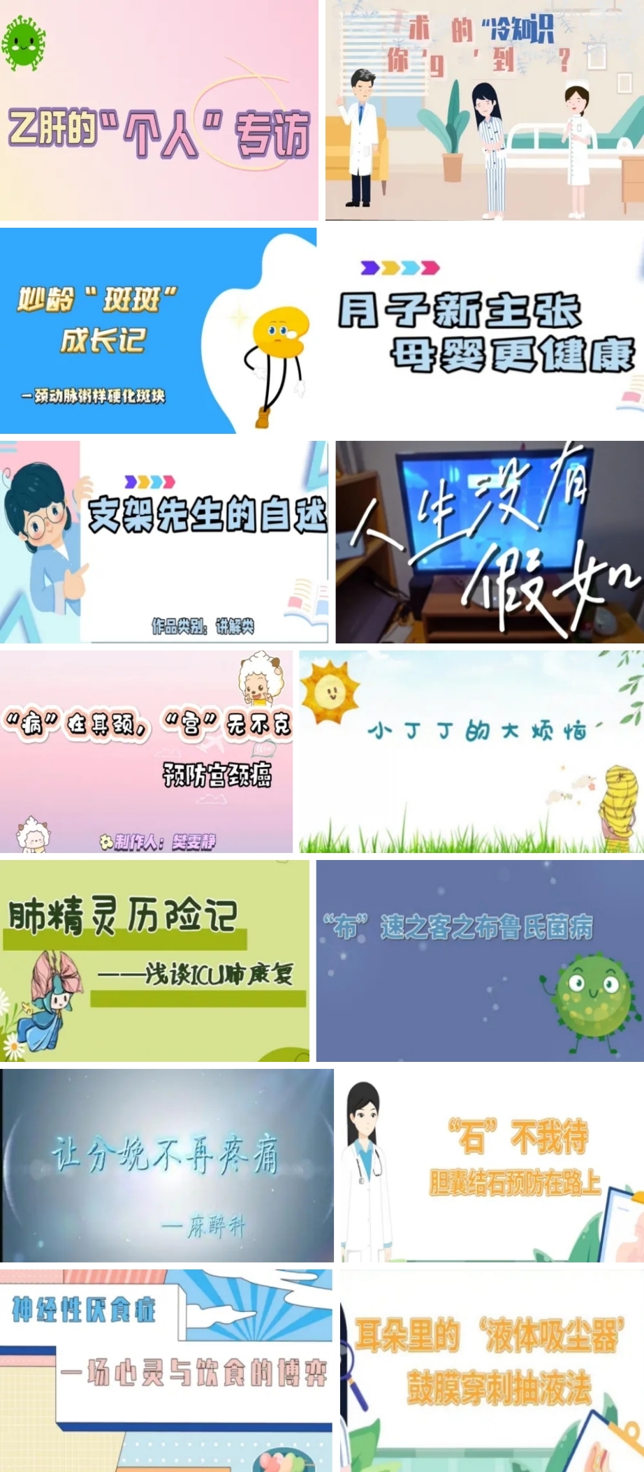 该院六大系统选送的14个参赛作品进行了精彩展示。消化内科赵洁带来《乙肝的“个人”专访》,以乙肝病毒的视角出发,追溯了乙肝的起源及发展历程,阐述了乙肝的发病机制、传播途径及增加乙肝风险的行为。中心手术部王媛分享了《温暖‘手’护——探究术后寒颤的秘密》,详细讲解了手术后低体温的原因、表现、危害及预防措施。门诊住院服务中心张莉带来《妙龄“斑斑”成长记》,以动画的形式,讲述了颈动脉斑块形成的高危因素和变化过程,科学解答了公众对颈动脉斑块的疑惑。妇产科三病区郭冬萍分享《月子新主张,母婴更健康》,通过阐述科学坐月子的理念和方法,帮助产妈妈们更好地度过产后恢复期。介入治疗室许伟带来《支架先生的自述》,以“支架先生”的口吻,介绍了冠心病的发病机制、治疗及预防,对大众关注的支架进行了科学解答。神经外科一病区杨化峰分享《人生没有假如——别让脑卒中悄悄来袭》,介绍一位脑卒中患者发病前的生活状态及诱发脑卒中的不良生活习惯,以此来反思现实生活中的不良行为方式。妇科泌尿生殖肿瘤科樊雯静带来《“病”在其颈,“宫”无不克——预防宫颈癌》,以动漫的形式,引入《喜羊羊与灰太狼》动画人物原型,讲解了宫颈癌的概念、临床表现和预防方法。儿科门诊王晓琴分享《小丁丁的大烦恼》,对包皮的作用、形态、手术指征、手术年龄做了细致讲解,消除家长们对包皮手术的各种疑惑。重症医学科王梦瑶带来《肺精灵历险记——浅谈ICU肺康复》,以生动形象的视频内容向大家展示了肺康复的重要性及如何落实肺康复方案。淋巴肿瘤科郭燕晶分享《“布”速之客之布鲁氏菌病》,通过动漫的形式,从布病的定义入手,逐一介绍了布病的传播途径、主要表现及预防措施。麻醉科刘俊钗带来《让分娩不再疼痛》,科普了分娩镇痛的定义、适应症及优点,使孕产妇科学认识分娩镇痛。胆胰外科王巧林分享了《小石头大隐患——预防结石在路上》,通过医生与患者问答的形式,介绍了胆囊结石的发病原因、好发人群、常见症状及检查方法。精神卫生科田静分享《神经性厌食症——一场心灵与饮食的博弈》,提高了公众对神经性厌食症的认识。耳鼻喉头颈外科门诊张婷婷带来《耳朵里的“液体吸尘器”——鼓膜穿刺抽液法》,讲解了分泌性中耳炎最常用的治疗手段鼓膜穿刺术。