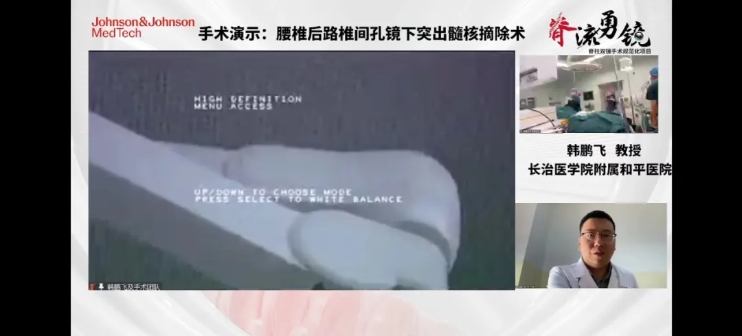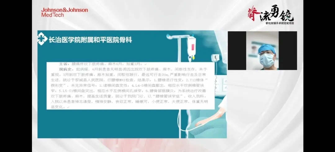 在精彩的手术演示之前,长治医学院附属和平医院骨科团队的常彬副主任医师首先进行了详尽的病例汇报。随后,长治医学院附属和平医院骨科副主任韩鹏飞亲自操刀,携助手刘宇主治医师,在网络平台上进行了一例腰椎后路单轴内镜椎板开窗髓核摘除术的手术演示。