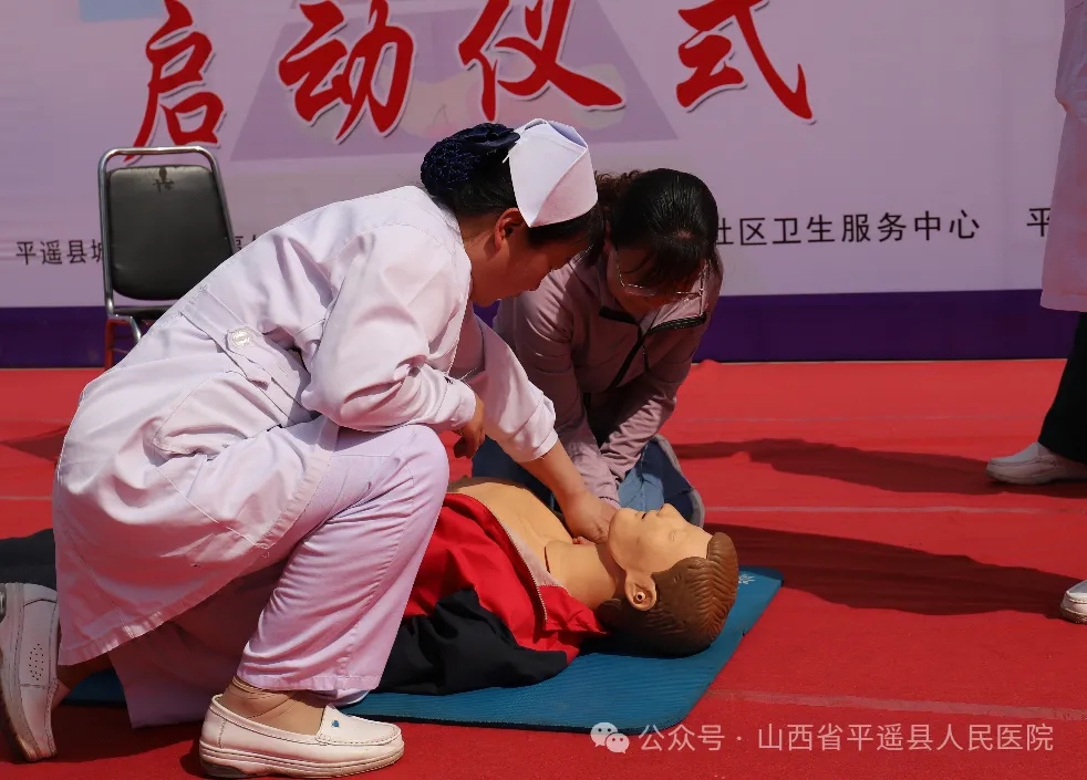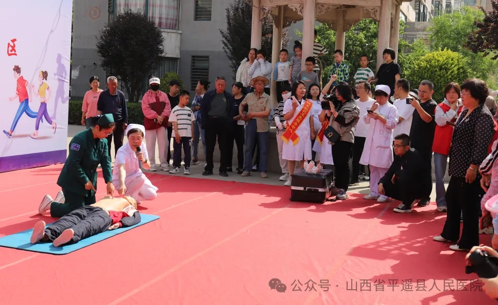 义诊现场,平遥县人民医院呼吸内科、儿科、骨科、普外科、妇产科等17个科室的专家、城东社区卫生服务中心汇丰社区签约团队为居民们提供义诊咨询服务。各位专家询问居民身体情况,认真仔细查体,提出治疗方案,给予健康饮食、合理用药的建议。平遥县人民医院急诊科团队现场演示讲解心肺复苏技术、海姆立克急救法,详细讲解操作步骤与要点,让居民们直观地了解到紧急情况下如何正确地进行急救操作,强化了大家的安全意识和应急处置能力。现场共计看诊人数200余人,发放宣传资料500余份。