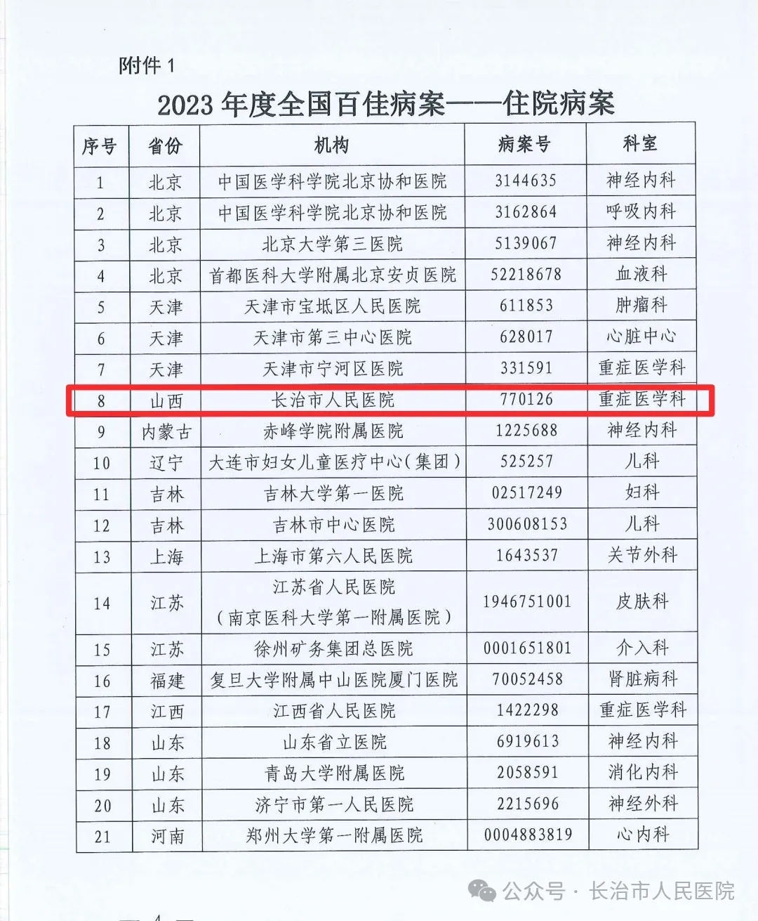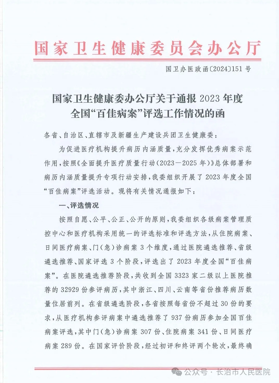 近日,在国家卫生健康委组织开展的2023年度全国“百佳病案”评选活动中,山西省医院协会常务理事单位——长治市人民医院选送的重症医学科王玮玮医生病案荣获“全国百佳病案”荣誉。此项殊荣系全国百佳病案40份“住院病案”中入选的山西省唯一一个优秀病案。