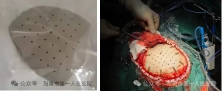 ▲PEEK-OPTIMA®颅骨嵌入式修补材料(上图左);术中PEEK-OPTIMA®颅骨嵌入式修补并成功固定(上图右)。