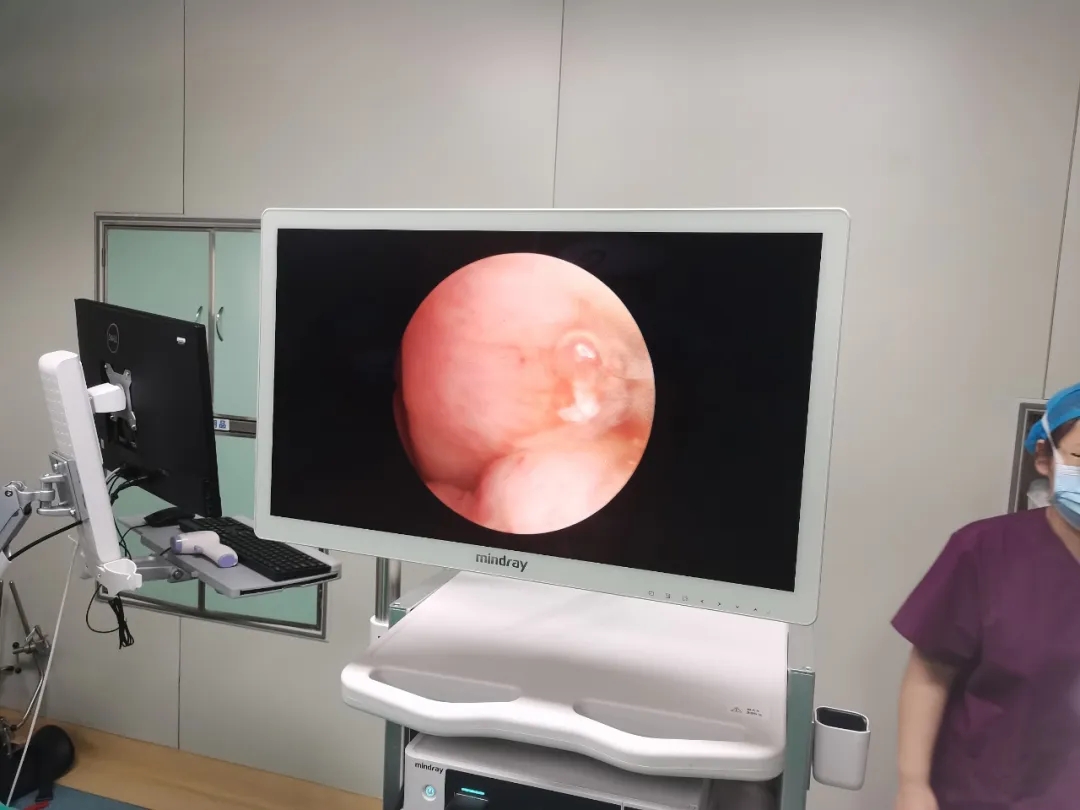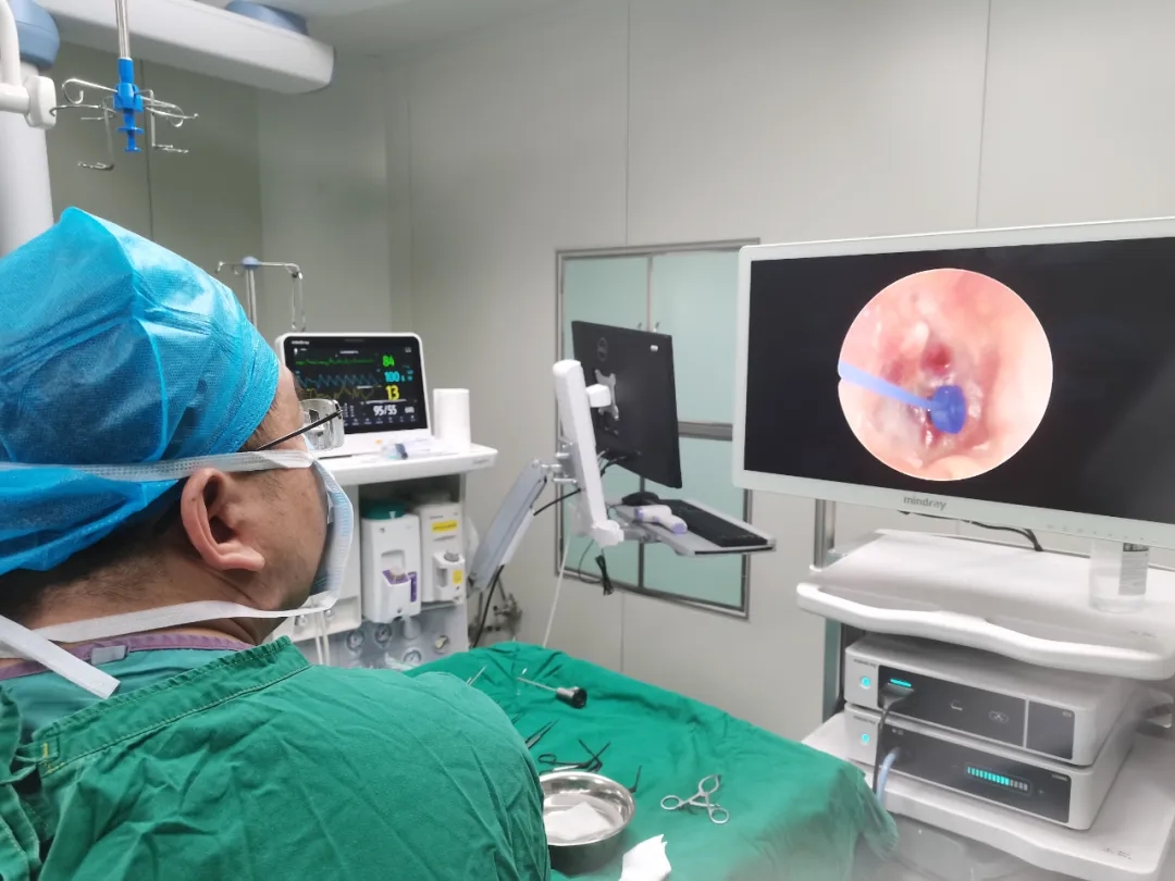 ▲专家为患者实施鼓膜切开置管术+咽鼓管球囊扩张术