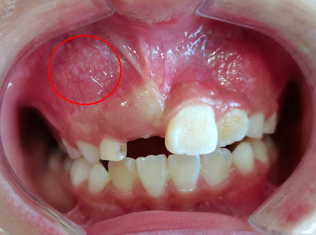 ▲口内照显示:右上乳牙根方可见粘膜及骨质膨隆