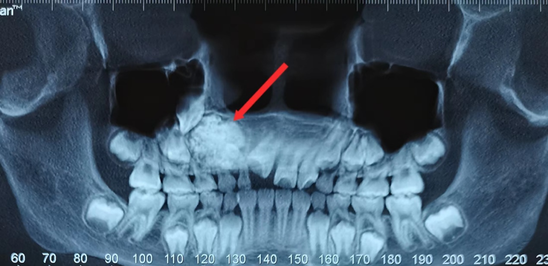患者为一名8岁小女孩,因牙齿不齐、门牙迟迟不换,在外院检查发现右侧上颌骨内有一肿物,考虑为“组合性牙瘤可能”,来院就诊。影像资料显示,小孩子右上颌骨内有大小不等、形态各异的牙体堆积高密度团块影。