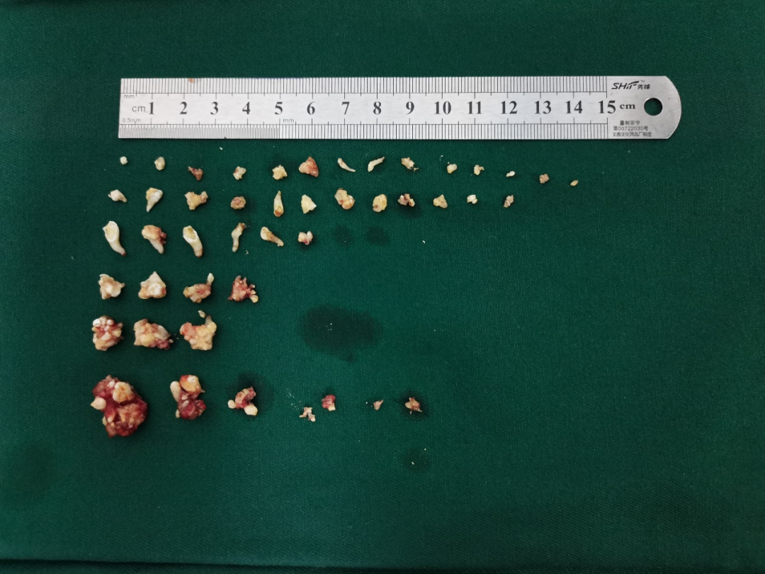 ▲术后瘤体标本:数十个大小不等、形态各异的牙体组织