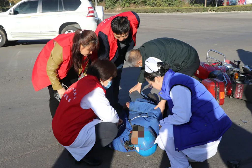 危急时刻,所有参加活动的党员立即组成救护小组,分工协作进行施救。山西省人民医院常驻护理专家、老年医学科护士长杨倩监测伤者生命体征、查看瞳孔、测量脉搏;河津市人民医院急诊科首席专家赵康民发现伤者神志不清,遂指导其正确卧位;妇科主任王永春、感染科护士长杨晓莹为伤者测量血压,同时安抚伤者;烧伤科主任张晓查看伤者肢体受伤情况;医技系列党员曹越临时指挥、疏导交通,避免造成二次伤害;自驾参加义诊的产科医生原晓倩自告奋勇道:“把伤者直接放我车上送医院吧,比120速度还快。”泌尿科首席专家冯景民紧接着说:“我护送伤者到急诊科,大家赶紧去社区义诊吧。”为确保安全,冯景民一直守护在伤者身旁,安抚情绪,监测病情,并通知本院急诊科做好急救准备。看着伤者被安全送走,义诊队伍才放心继续赶路。
