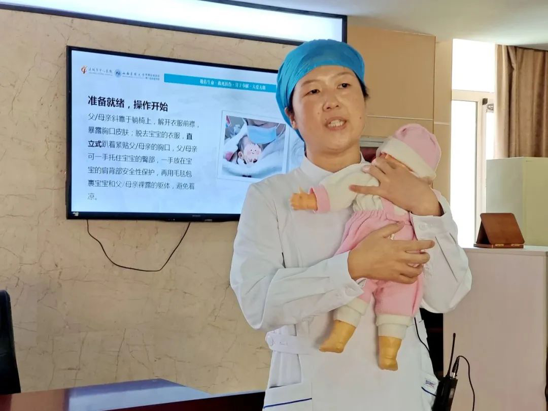 王晓丽采用现场问答形式与家长朋友们互动交流,强调口腔护理的重要性,提出牙齿健康要从小做起。孙丽园护师讲解演示同步进行,向大家科普“袋鼠式护理”在稳定生命体征、促进健康发育、缓解疼痛压力等方面的重要性,让家长们学会早期护理。