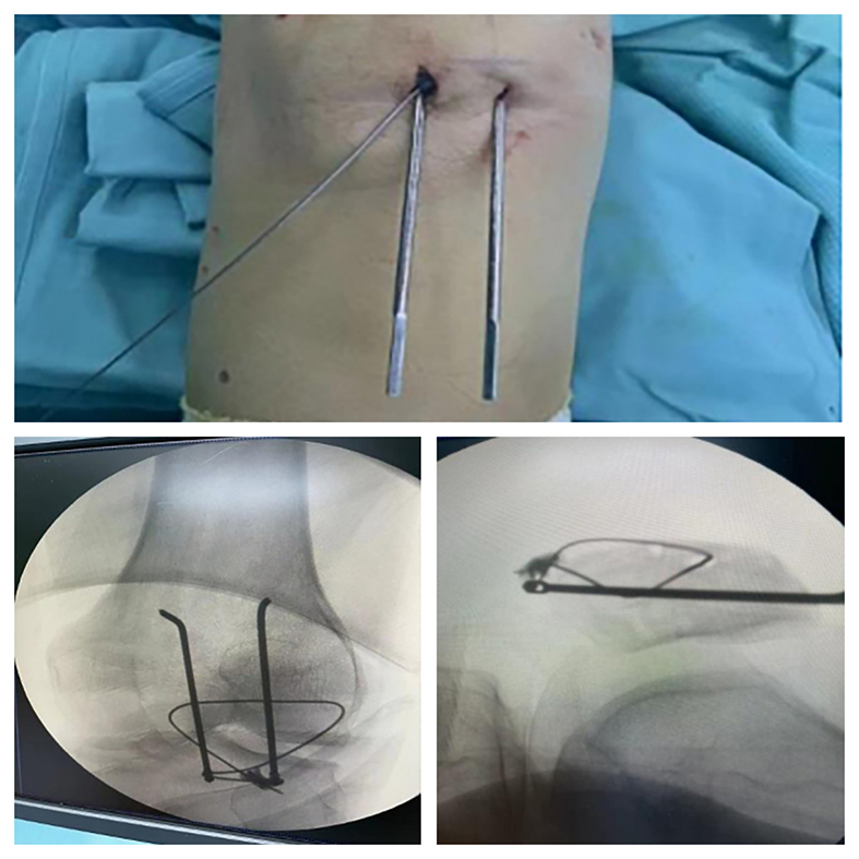 经完善相关术前检查,武海峰带领团队在腰麻下为患者实施手术。术中,经皮复位骨折,于患者髌骨下极垂直于横向骨折线经皮向上钻入两枚带尾孔髌骨针,再垂直与纵向骨折线,横行钻孔,分别切开0.5-1厘米的皮肤小切口,用钛缆8字加压收紧,形成张力固定。通过术中C臂透视,骨折复位固定良好,关节面平整,手术顺利完成。