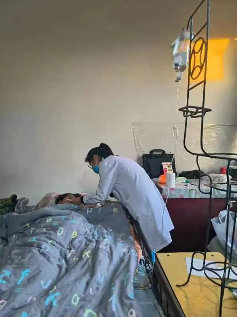 故事要从半月前说起,王先生85岁的老母亲冯奶奶因病瘫痪长期卧床,不能自主进食,只能靠胃管帮助输送水分和食物,靠尿管来排除尿液。半月前,郭红亮接到王先生的求助电话,诉求是母亲的胃管、尿管已到使用期限,需更换管道。接到电话,郭红亮立即带领和平医院“千名医师下基层”医疗团队和ICU护士长郝留萍来到距离县城40公里的洪水镇垴上村王先生家里。