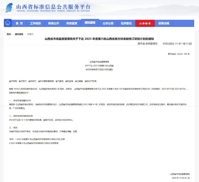 近日,山西省市场监督管理局下达2023年度第六批山西省地方标准制修订项目计划,通过部门推荐、形式审查、行业论证、专家研判确定了108项省级地方标准制定项目,其中由山西省医院协会常务理事单位——山西省人民医院申报涵盖门诊服务、医学影像数据、卫生应急、脑卒中筛查等四项省级地方标准获批立项。
