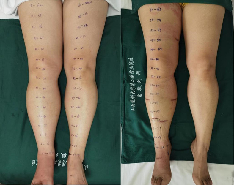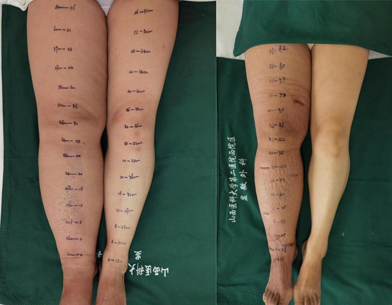 ▲ 左为术前张女士双下肢周径,右为术后张女士患肢周径