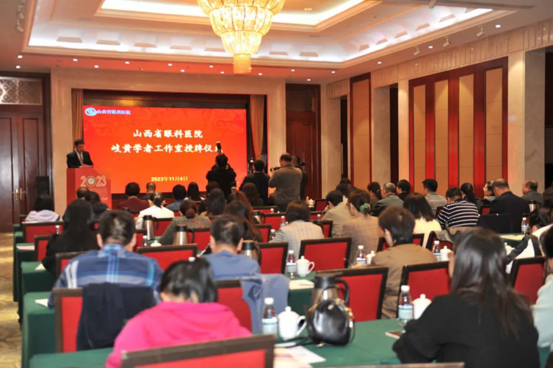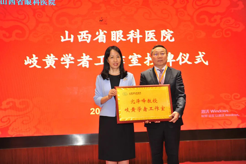 仪式上,孙斌致辞,李俊红与亢泽峰教授共同为山西省眼科医院“名中医岐黄学者亢泽峰眼科工作室”揭牌。