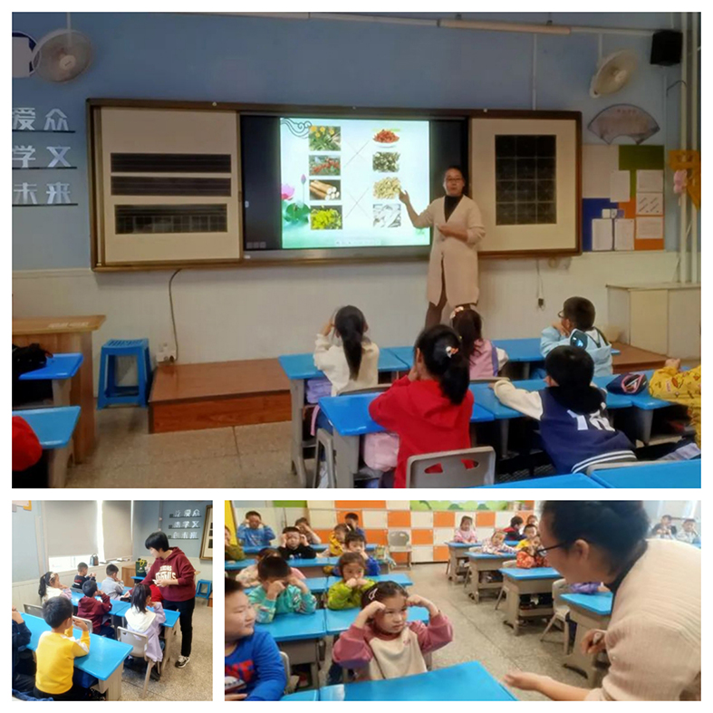 “同学们,你们知道菊花有什么作用吗?菊花具有散风清热、明目平肝的作用,可以泡水喝。”在一年级八班的课堂上,杨引第护士长首先给同学们发放了菊花、蒲公英、枸杞等中草药,让孩子们通过观察中草药的形状、色泽并闻其味,学习简单的中草药知识,让同学们和中医药来了个“零距离接触”。苗晋玲医生为学生们讲述张仲景、华佗等中医名医小故事,使他们了解了很多课本之外的历史典故和医学常识,并介绍望、闻、问、切四种中医诊断疾病的基本方法,带领同学们认识中医常用的治疗方式针灸、按摩、推拿、拔罐等,将中医文化种在了同学们的心中。此外,杨引弟护士长还带领大家背诵古诗《九月九日忆山东兄弟》,为同学们发放制作的吴茱萸香包。