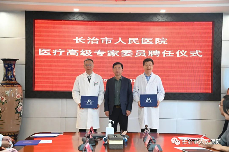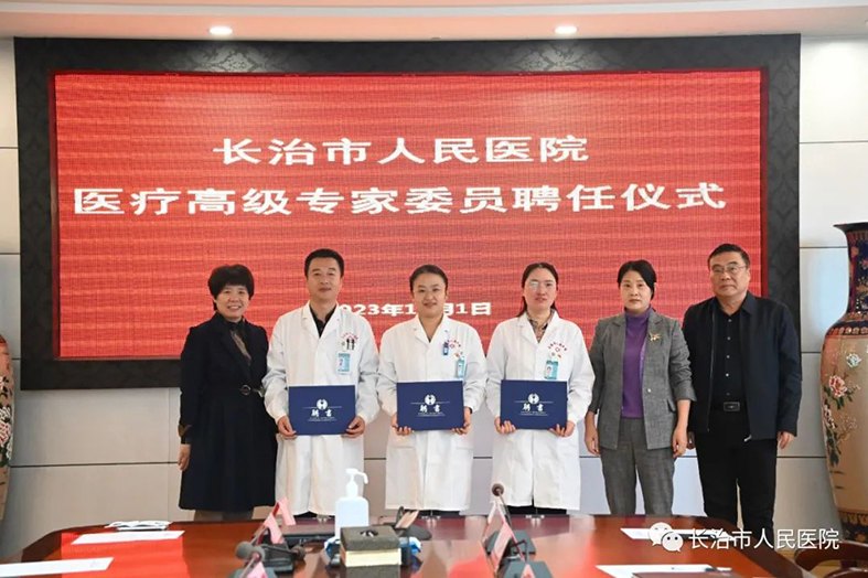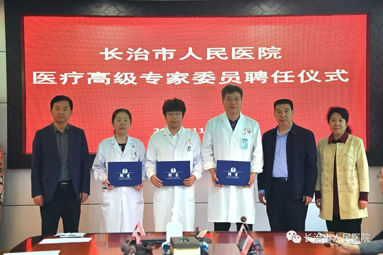 会议宣读《关于成立长治市人民医院医疗高级专家委员会的通知》文件,任命张玉平为专家委员会主任,杜永刚为副主任,委员会成员王峰、毕淑珍、李学雷、李勇爱、宗亮、赵军、韩妍。院领导为受聘专家们颁发聘书。