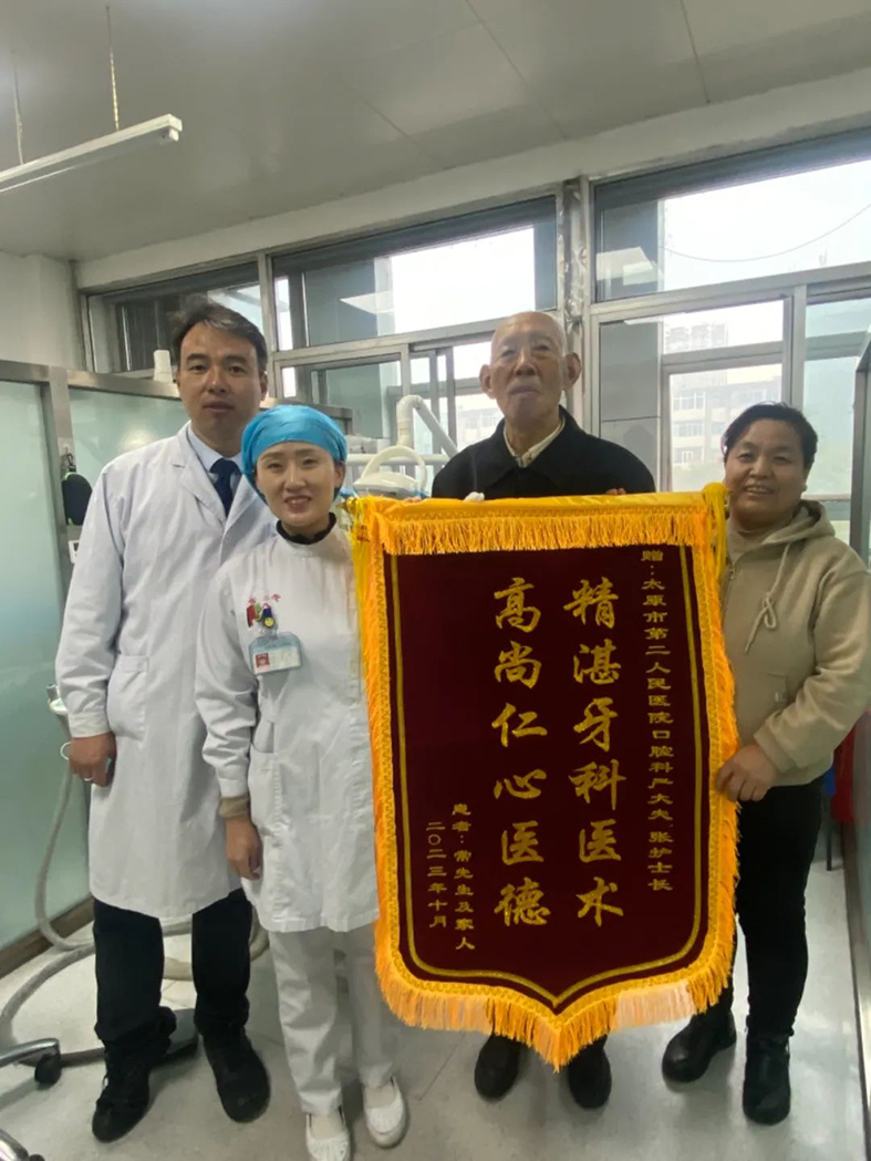 10月23日,正值重阳节,山西省医院协会常务理事单位——太原市第二人民医院口腔科收到两面锦旗,一面是92岁高龄患者常双全在如愿佩戴假牙后送来的;另一面是辗转多家医院咨询,最终在该科接受拔牙治疗的患者送来的。