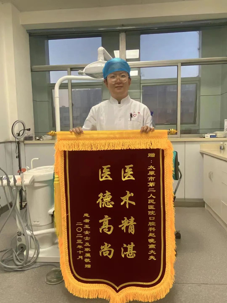第二面锦旗是赠送给赵晓燕大夫的。患者因为智齿需要拔除,但又害怕拔牙,内心一直纠结,奔波多家医院咨询,最后选择了太原市第二人民医院。患者在术后说:“赵医生至少讲述了10遍以上拔牙过程及术后注意事项,非常耐心细致、不厌其烦,真心为赵大夫高度敬业的工作态度点赞!”(李文婕)